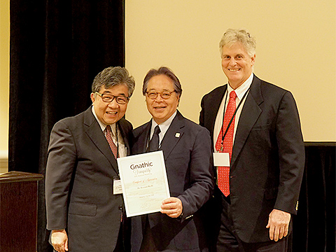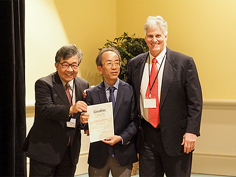 モデレーターを務める平木先生(左)からサティフィケートを手渡される池田先生(中央)とJim先生(右)