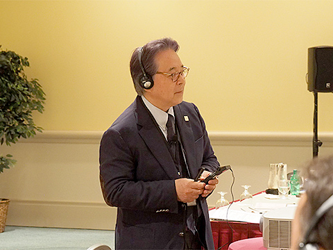 レシーバーを通して、スペイン語での質問を聞く池田先生