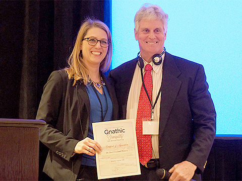 モデレーターのJim先生(右)からサティフィケートを受け取るDori先生(左)