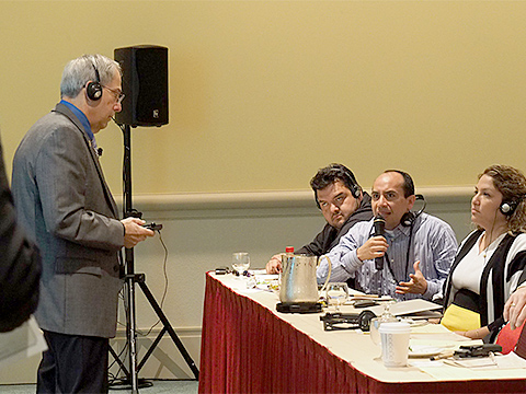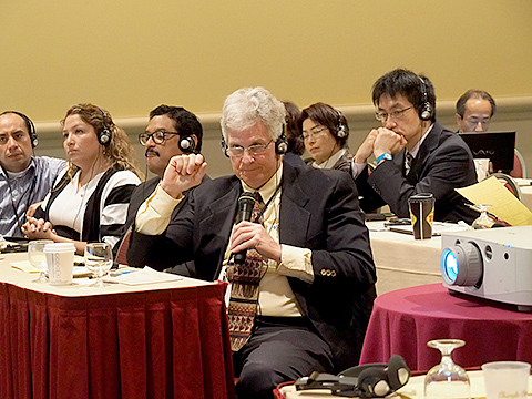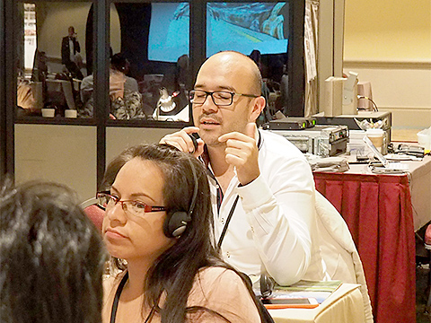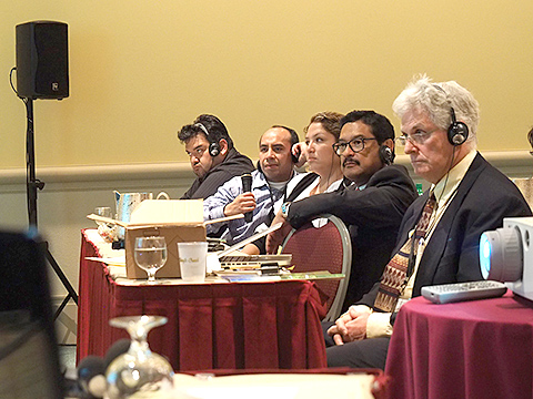 質問しているメキシコからの参加者(右)とレシーバーを通して質問内容を聞くTed 先生(左)